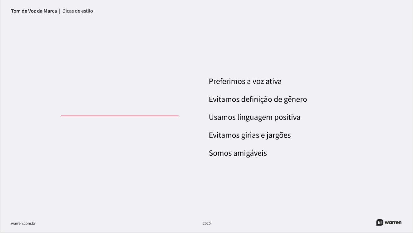 A partir de ampla coleta de dados, partimos para a criação de novas diretrizes. Registramos tudo em um novo brand book completo, que guia a Warren há alguns anos, incluindo proposta de valor, posicionamento, voz e tom, além de diversas determinações visuais.
