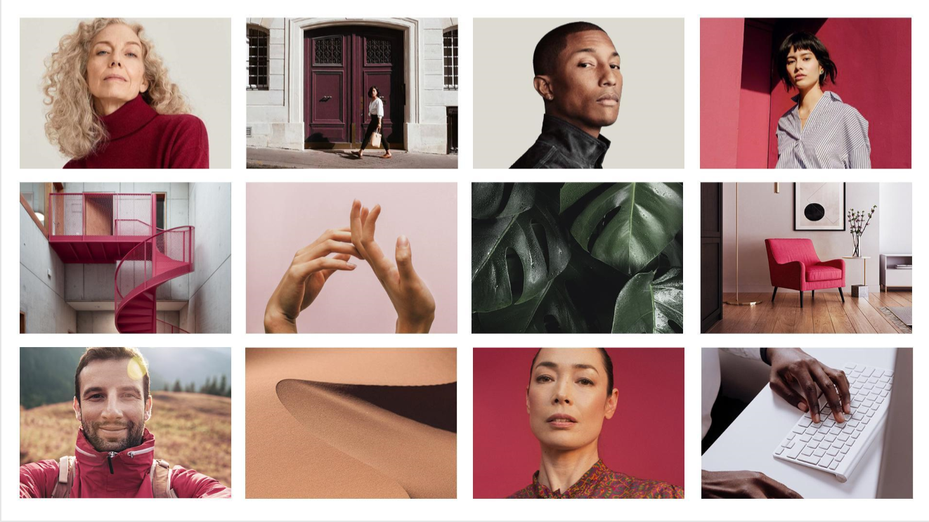 Elemento do logo da Warren se torna input para intervenção gráfica nas fotos. A cor magenta sempre como detalhe nas fotos.